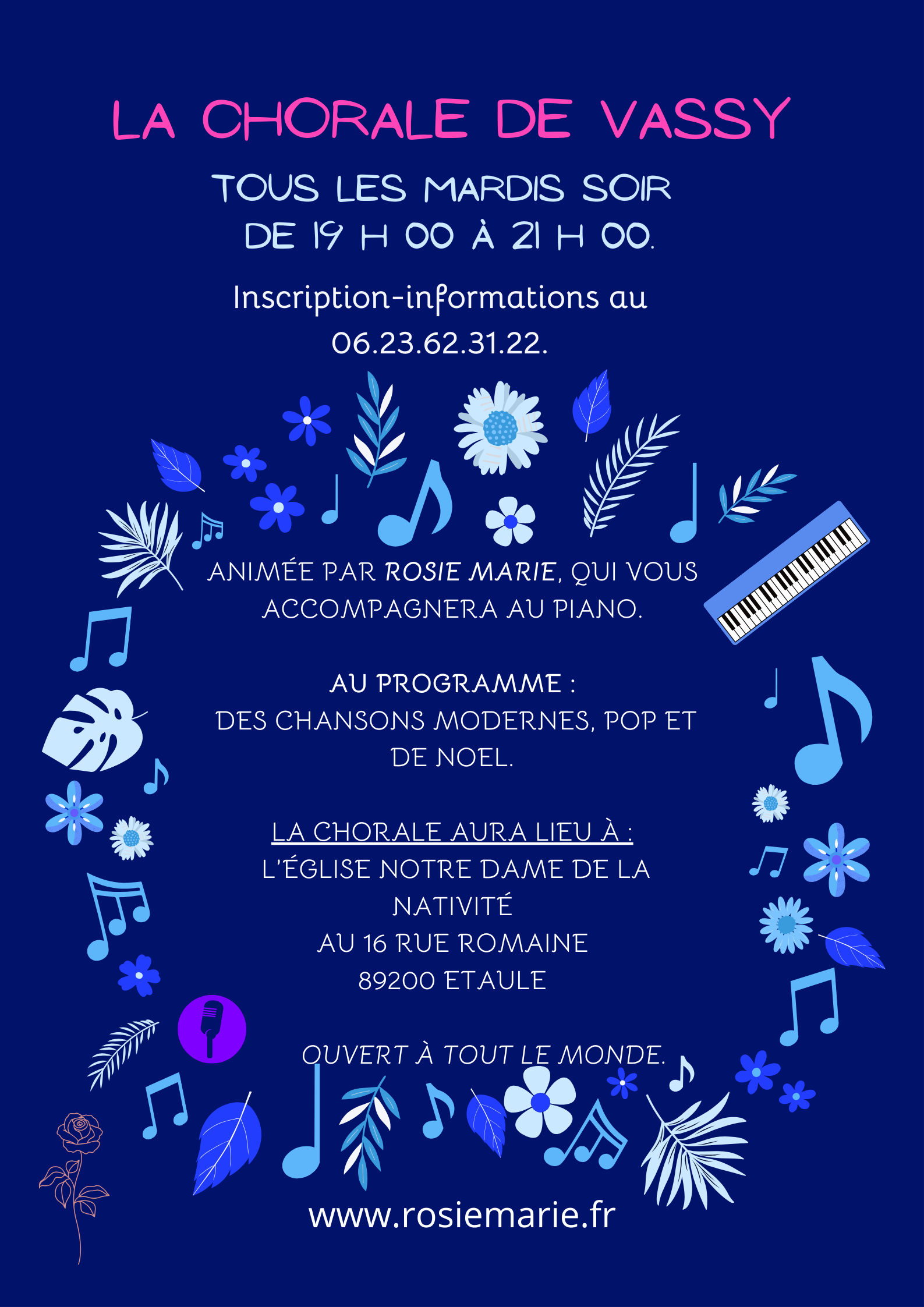 Je suis ravie de vous dire qu'à partir de la rentrée septembre 2024 j'anime une chorale sur la commune de Vassy 89200 Etaule.
