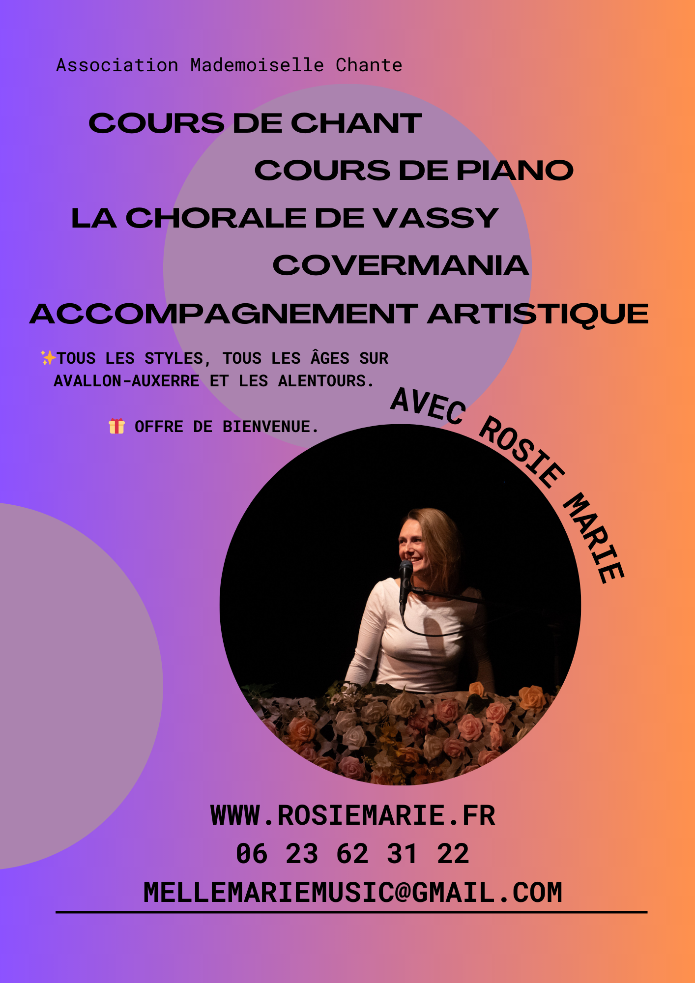 Les inscriptions par tél : 06 23 62 31 22 ou par mail : mellemariemusic@gmail.com ou bien venez me rencontrer le 07 septembre au forum des associations.